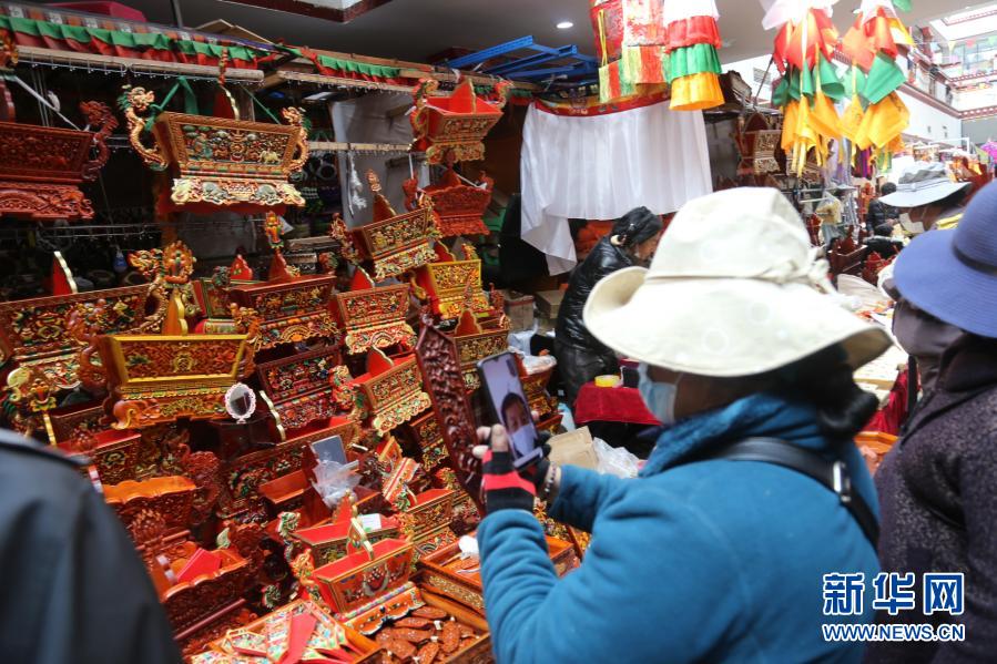 在拉薩八廓商城,七彩的酥油花、精美的切瑪盒、飄香的卡塞(一種油炸面食)、寓意吉祥的羊頭……藏式特色年貨琳瑯滿目,前來采購的人絡繹不絕。藏族姑娘桑吉卓瑪最近在商城支起了小攤,售賣青稞苗、酥油花等新年用品,“前兩年我們家脫了貧,好生活要靠自己雙手來創造。”新年新氣象,口罩難掩她喜悅的笑容。