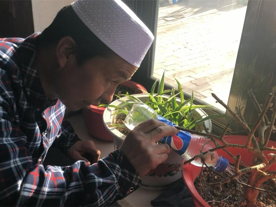 寧夏平羅縣脫貧戶馬康福正在給家中綠植澆水。新華社記者張亮 攝