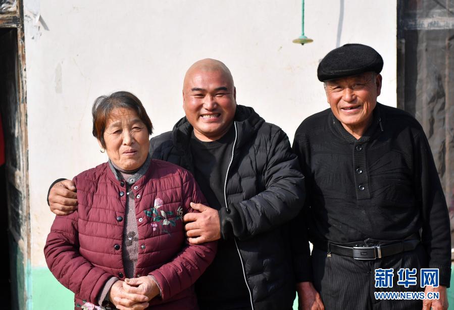 在河南省西華縣皮營辦事處雙樓理社區,理沖鋒在家中和父母合影(2月9日攝)。新華社記者 李嘉南 攝