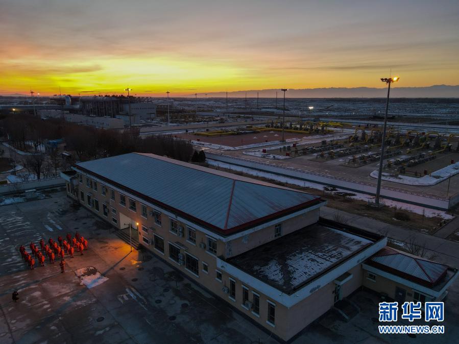 清晨的新疆霍爾果斯壓氣首站,賽依克江·吾龍和工友們在進行班前點名(2月4日攝,無人機照片)。新華社記者 高晗 攝