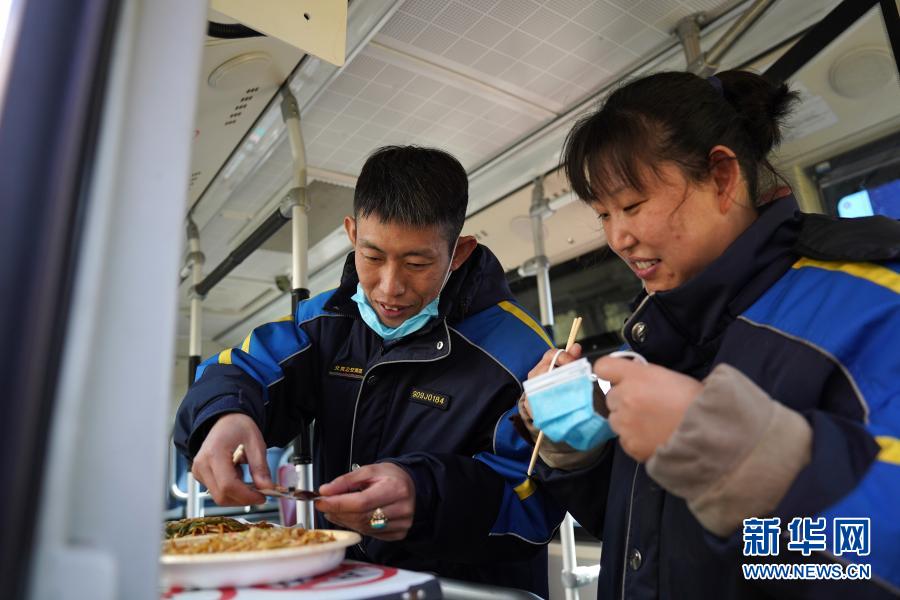 在地鐵建國門站,姜楠(左)和柴麗莉在公交車上一起吃午飯(2月10日攝)。新華社記者 鞠煥宗 攝