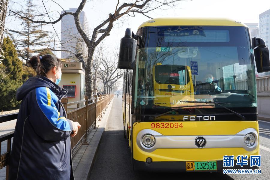 在地鐵建國門站,柴麗莉(左)在等候姜楠駕駛的公交車進站(2月10日攝)。新華社記者 鞠煥宗 攝