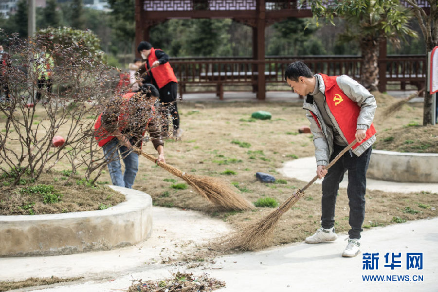 貴州省龍里縣冠山街道五新村志愿者春節期間打掃廣場。(新華社記者陶亮攝)