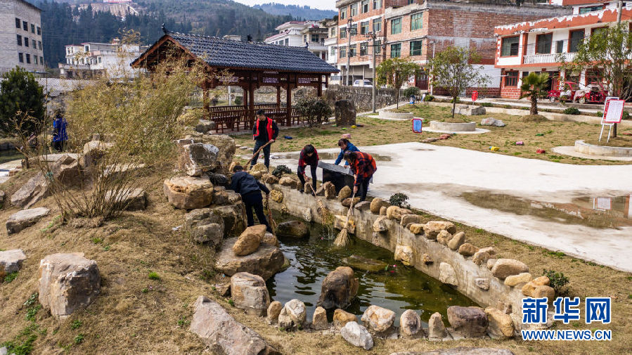 貴州省龍里縣冠山街道五新村的志愿者春節期間清理廣場池塘(新華社記者陶亮攝)