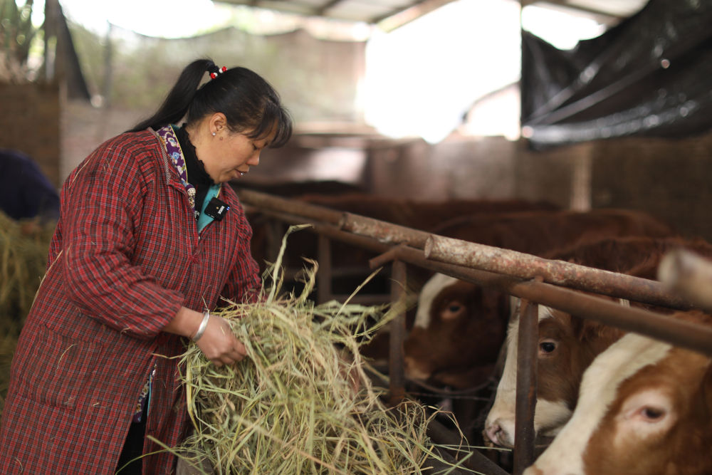 重慶豐都縣十直鎮秦榜溝村建卡貧困戶付體碧在給牛喂食。新華社記者陶冶 攝