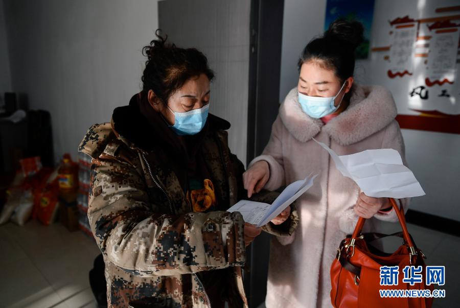 趙淑華(左)查看一位社區居民的核酸檢測報告等相關防疫文件(2月15日攝)。新華社記者 許暢 攝