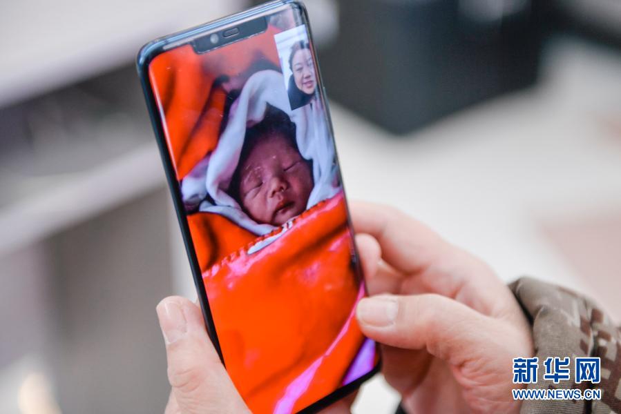 趙淑華與她的兒子、兒媳視頻連線,隔空看到了當日出生的孫子(2月16日攝)。新華社記者 許暢 攝