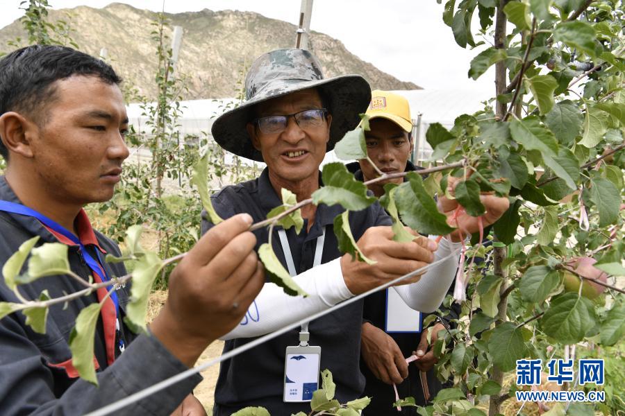 一名技術人員(中)在指導山南市貢嘎縣森布日村村民管理蘋果樹(2020年7月29日攝)。新華社記者 張汝鋒 攝