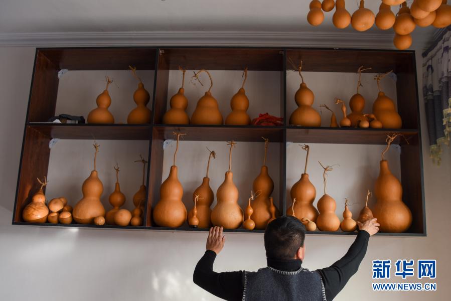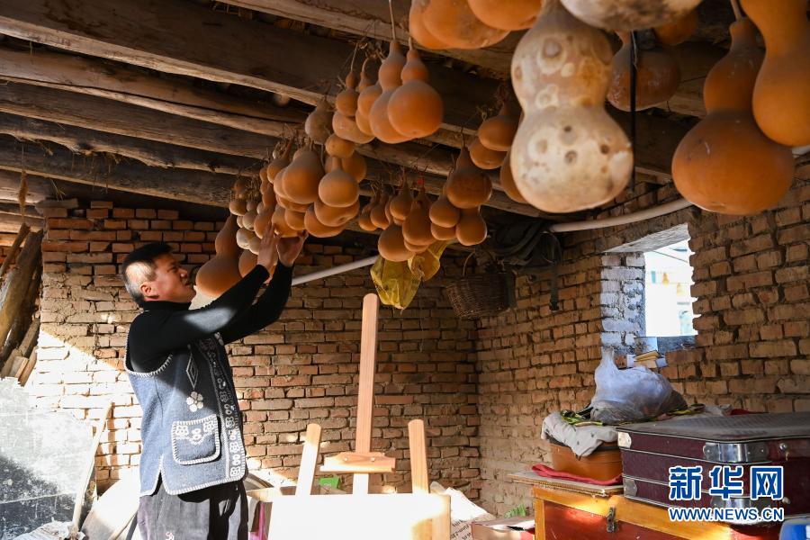 曹光耀在位于霍爾果斯市加爾蘇村的家中整理挑選出來的葫蘆(2月6日攝)。新華社記者 丁磊 攝