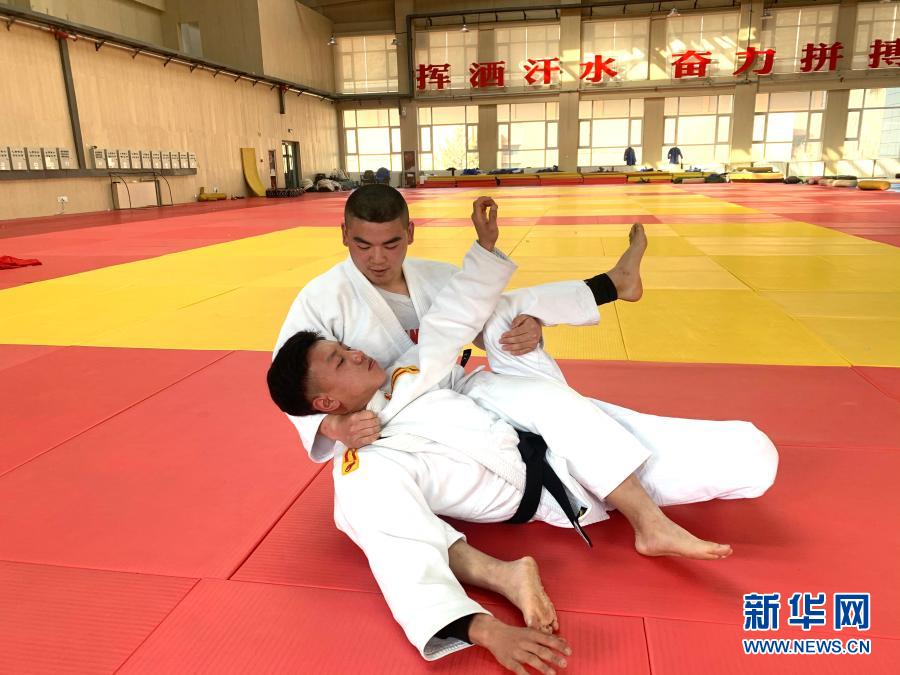 2月24日,在多巴基地,青海體工一大隊柔道隊隊員冶承毓(前)和隊友呂尋才在訓練中。新華社記者 李琳海 攝