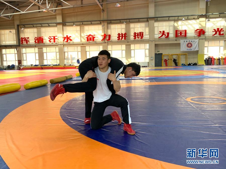 2月24日,在多巴基地,青海體工一大隊摔跤隊隊員嘎朝拉(前)和隊友在訓練中。新華社記者 李琳海 攝