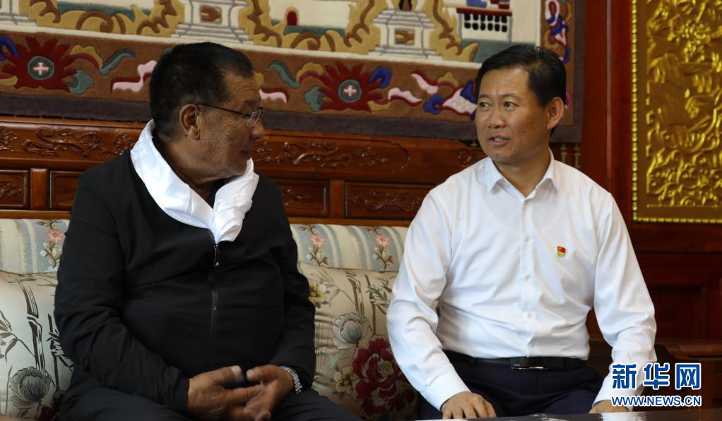 7月6日,張峰(右)與青海省海南藏族自治州共和縣恰卜恰鎮索吉亥村村民華旦交流。新華社記者 央秀達珍 攝