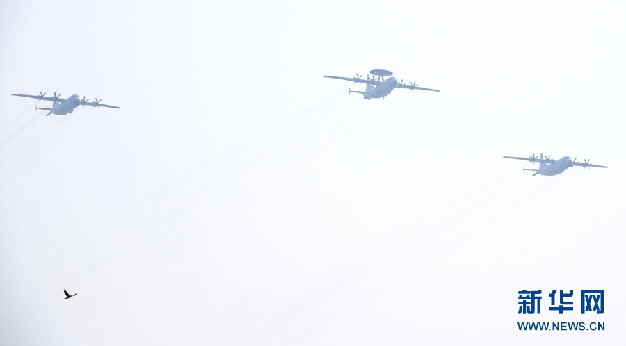 新華社北京10月1日電(黃書波、周正新)空警-500H預警機、空警-200H預警機、運-8反潛巡邏機、運-8技術偵察機組成的海上巡邏機梯隊,1日上午飛過天安門廣場上空,作為海軍新型信息作戰力量的4型特種機首次集體亮相。