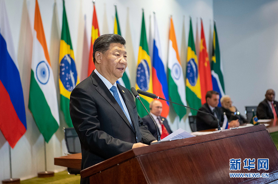 當地時間11月14日,金磚國家領導人同金磚國家工商理事會和新開發銀行對話會在巴西利亞舉行。中國國家主席習近平、巴西總統博索納羅、俄羅斯總統普京、印度總理莫迪、南非總統拉馬福薩共同出席。這是習近平發表講話。 新華社記者 張領 攝