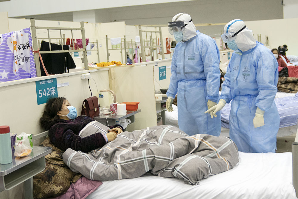 武漢客廳方艙醫院醫護人員在詢問患者病情(新華社記者熊琦攝)