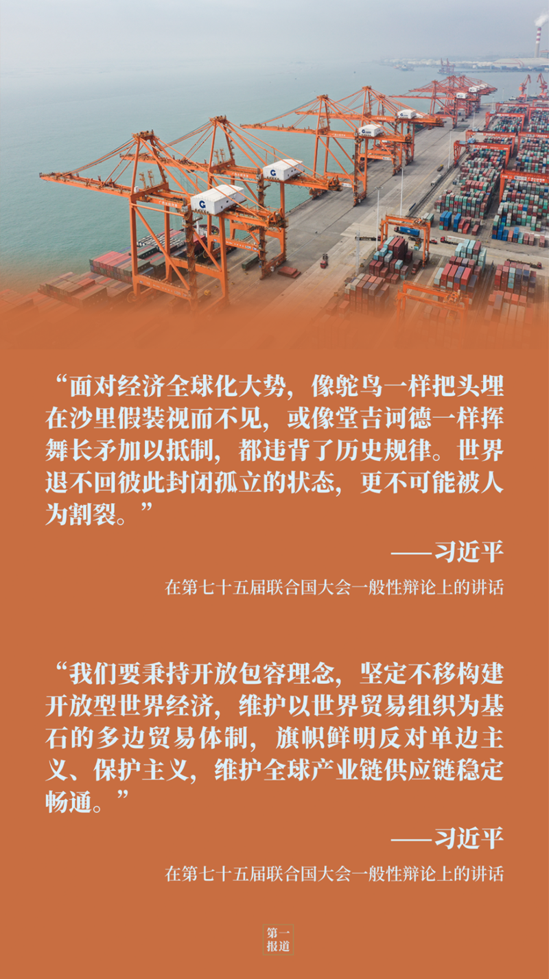 在聯合國“云講臺”,習主席還向國際社會生動闡釋了中國“新發展格局”與構建開放型世界經濟、推動全球經濟復蘇的關系:“我們不追求一枝獨秀,不搞你輸我贏,也不會關起門來封閉運行,將逐步形成以國內大循環為主體、國內國際雙循環相互促進的新發展格局,為中國經濟發展開辟空間,為世界經濟復蘇和增長增添動力。”