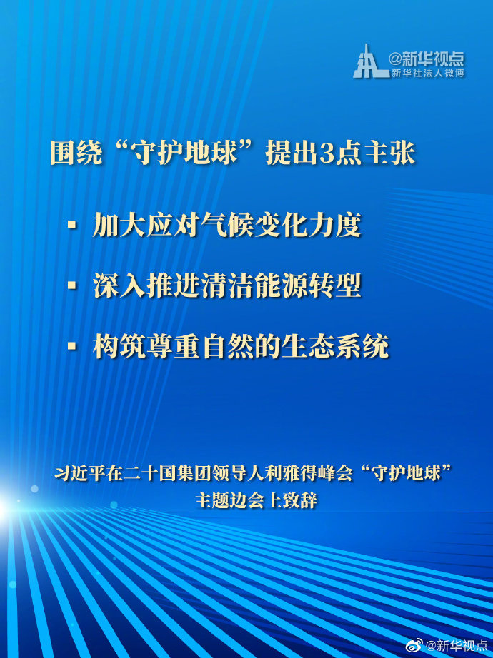 國家主席習近平11月22日在二十國集團領導人利雅得峰會“守護地球”主題邊會上提出3點主張。