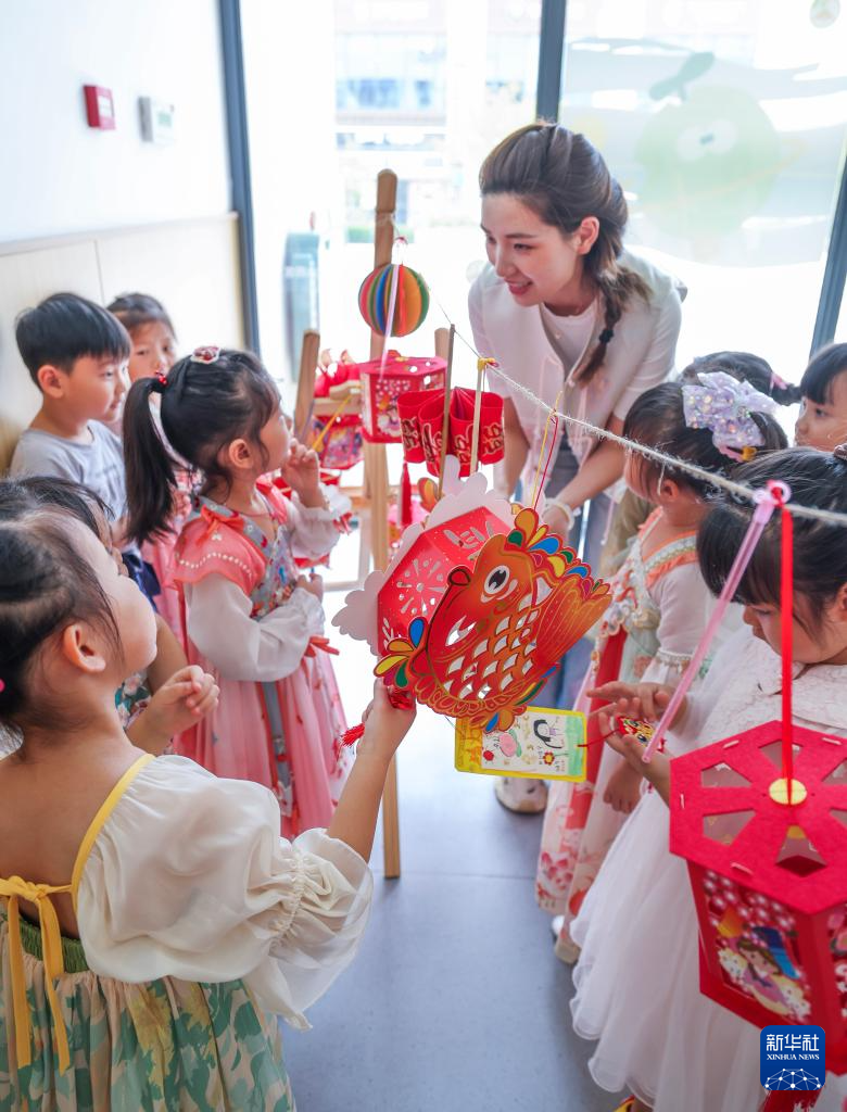 9月12日,在(zai)長(chang)興縣開發區中心(xin)幼兒園,孩子在(zai)觀看同學(xue)及家長(chang)制作的中秋創意(yi)燈籠。