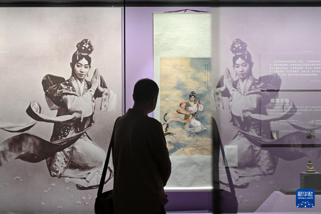 9月12日,觀(guan)眾(zhong)參觀(guan)梅(mei)蘭(lan)芳在京劇《天女散花》中的(de)劇照(左)和徐悲鴻畫作《天女散花》(復(fu)制(zhi)品)。