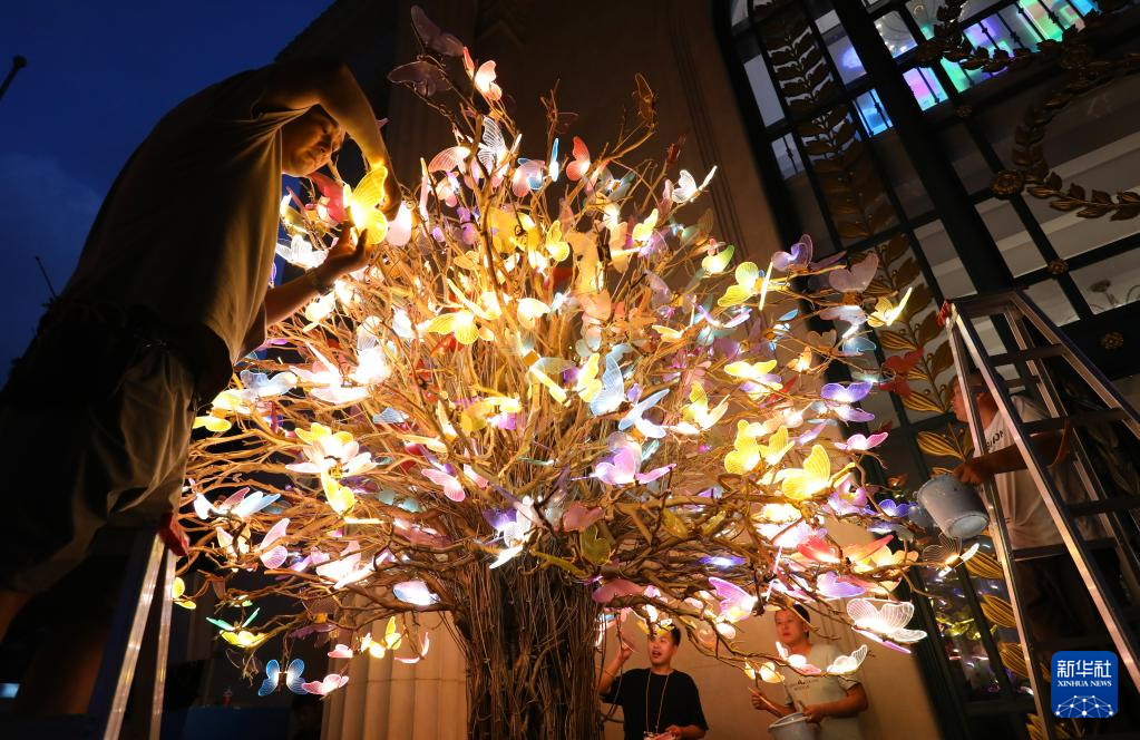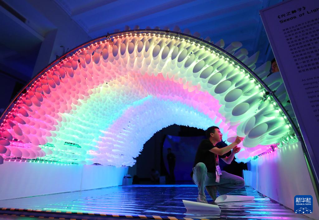9月18日,工作人員(yuan)安裝調(diao)試燈光裝飾藝術作品(pin)。
