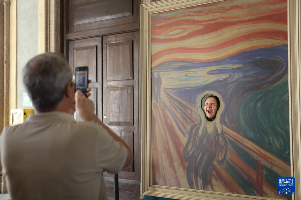 9月22日(ri),在意(yi)大利米(mi)蘭王宮,觀眾與蒙(meng)克畫(hua)作《吶喊》互動裝置合影。