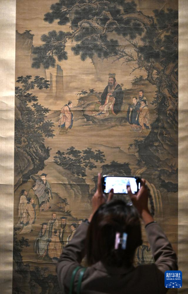 這是(shi)展(zhan)出的(de)明代(dai)孔子講學圖軸(9月29日(ri)攝)。