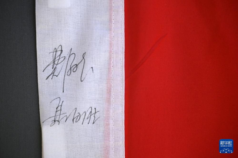 9月29日在展(zhan)覽上(shang)拍攝(she)的(de)航天員費俊龍、聶(nie)海勝在搭乘“神舟”六號(hao)載(zai)人飛船飛行時(shi)展(zhan)示的(de)國旗上(shang)的(de)簽(qian)名。