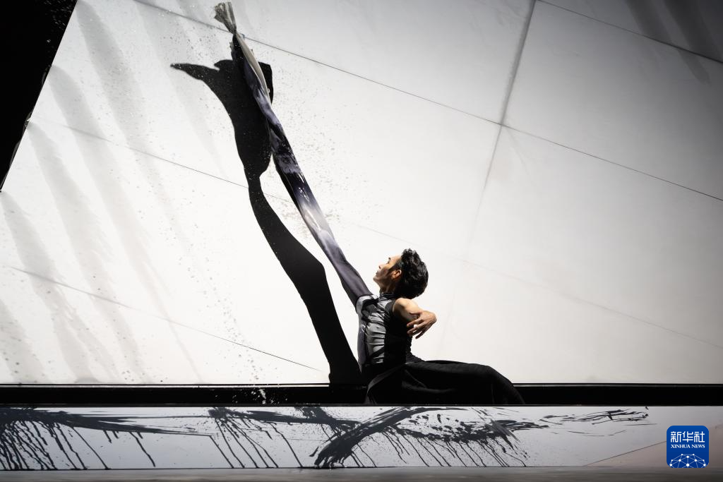 香(xiang)港(gang)舞(wu)蹈團《快雪時晴》在舞(wu)臺設計上加入(ru)水墨(mo)元素(su),舞(wu)者與之互動會留下(xia)書法般的痕跡(10月11日攝(she))。新華社發(香(xiang)港(gang)舞(wu)蹈團供圖)