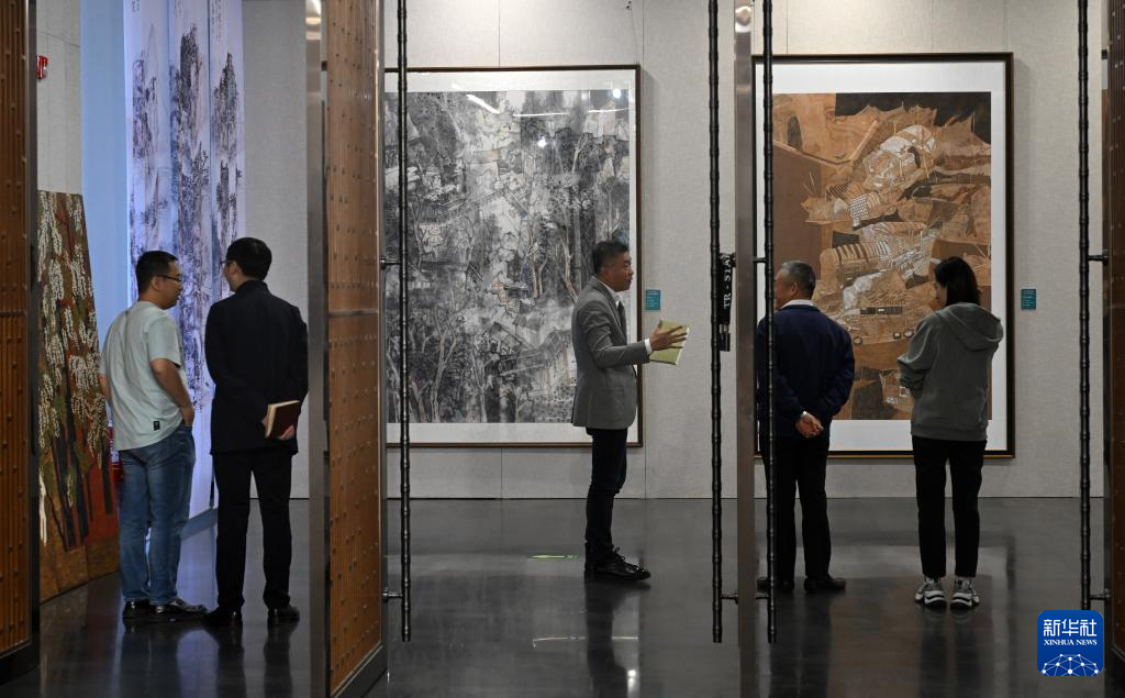 10月(yue)15日,策展人譚國亮介紹展出的畫作。