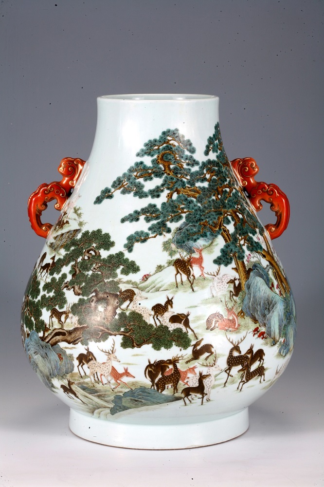 展出的(de)“清乾隆款粉彩雙鳳耳百鹿尊”。(沈陽故宮博物院供圖)