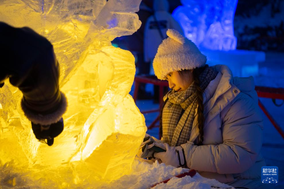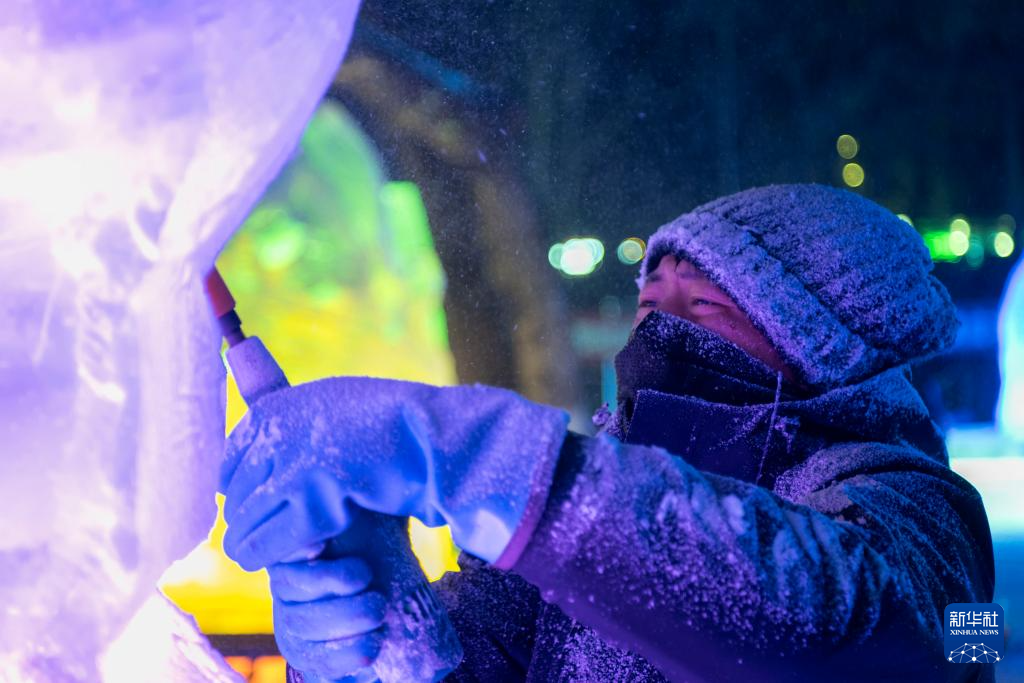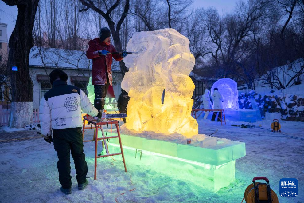 1月2日,在哈爾濱市道里區,冰雕師在兆麟公園內雕琢2025年哈爾濱亞冬會主題冰雕作品。