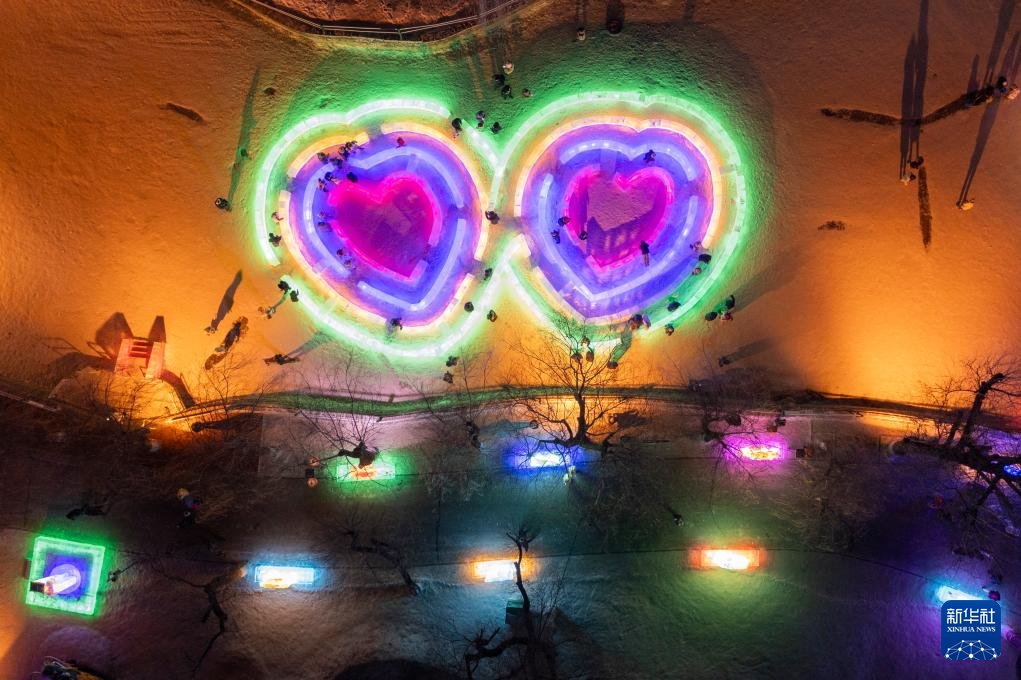 1月2日,在哈爾濱市兆麟公園,游客在冰燈藝術游園會園區內觀賞冰燈(無人機照片)。