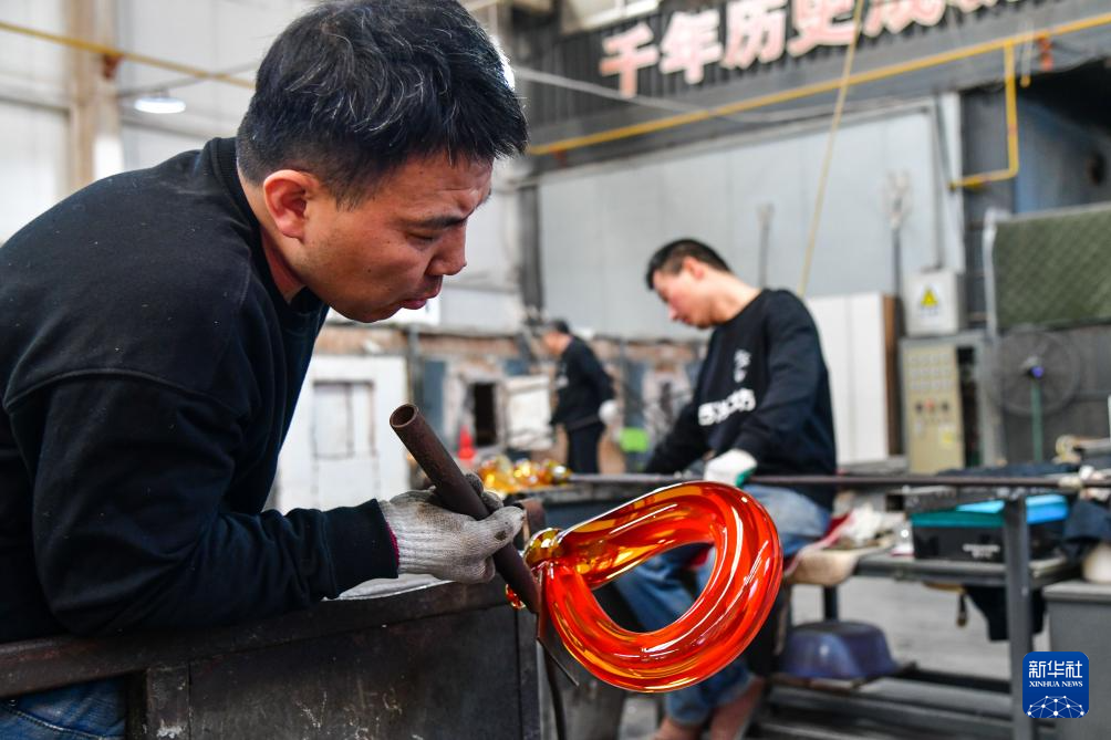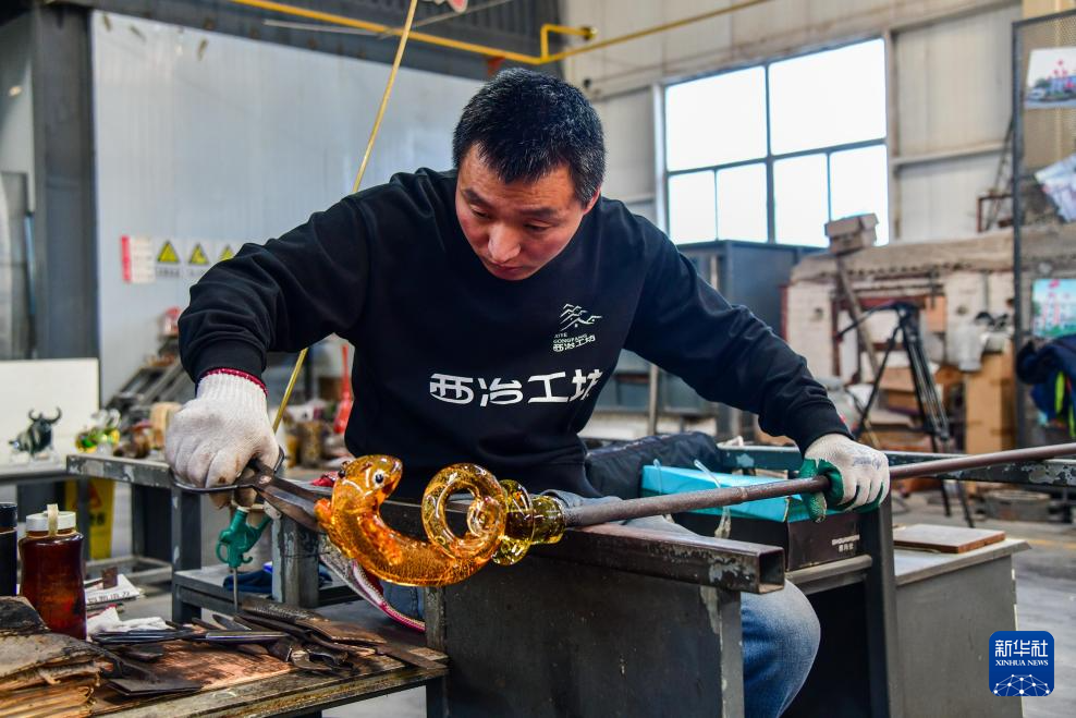 1月9日,在淄博市博山區的西冶工坊,工匠在加工琉璃工藝品。