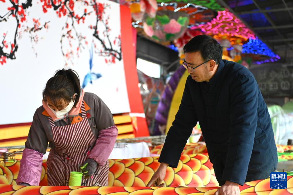 1月8日,在寧(ning)夏固原(yuan)市隆德花燈傳承基地,蘇紅章(右)在生(sheng)產車間與工(gong)人交流。