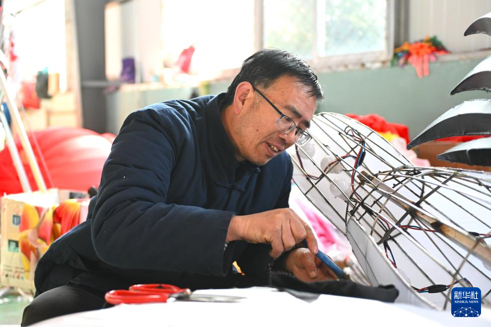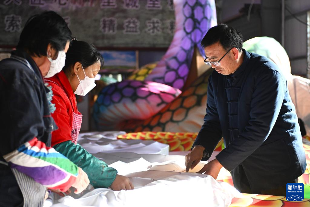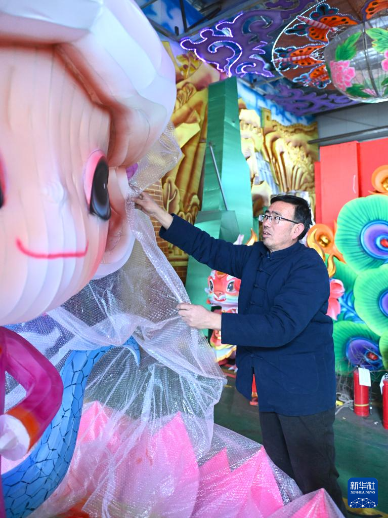1月8日,蘇紅(hong)章在寧夏固(gu)原市隆德花(hua)燈傳承(cheng)基地生(sheng)產車間查看 “蛇”元素花(hua)燈。