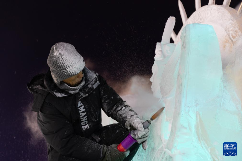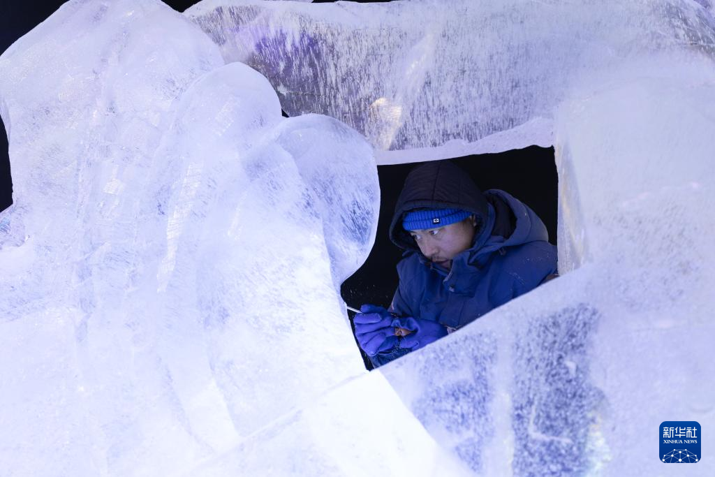 1月15日(ri),參賽選手在哈爾濱冰(bing)雪(xue)大世界(jie)園(yuan)區(qu)進行(xing)冰(bing)雕創作。