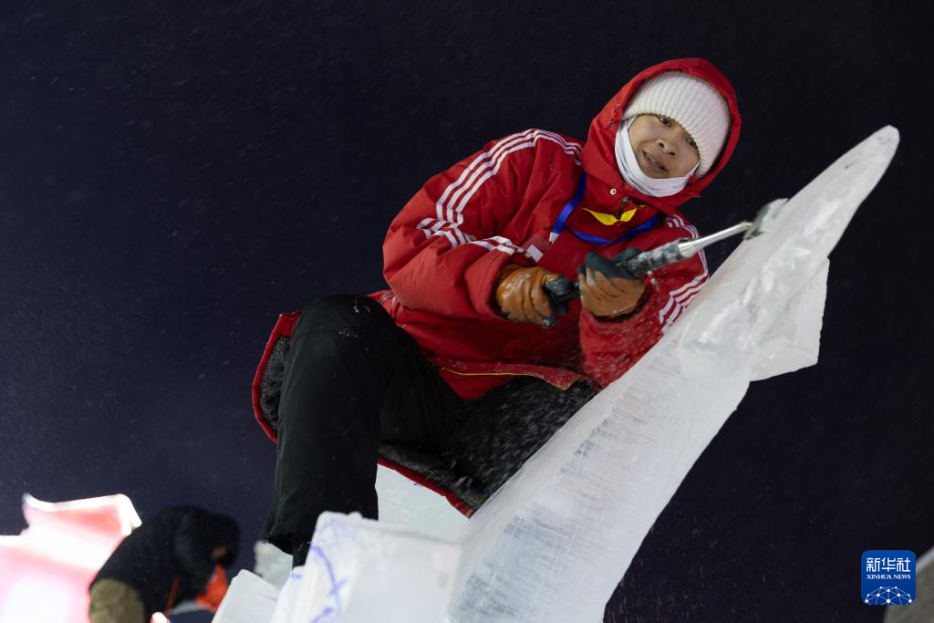 1月15日,參賽選手在哈爾濱冰雪大世界(jie)園區(qu)進(jin)行冰雕創作。