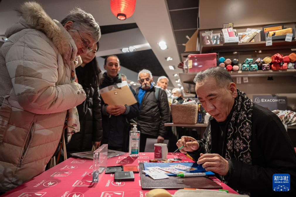 1月18日(ri),在法國巴(ba)黎舉行(xing)的蛇(she)年生肖(xiao)郵票(piao)發行(xing)儀式上,郵票(piao)設(she)計(ji)者陳(chen)江洪為(wei)當地集(ji)郵愛好者簽字留(liu)念。