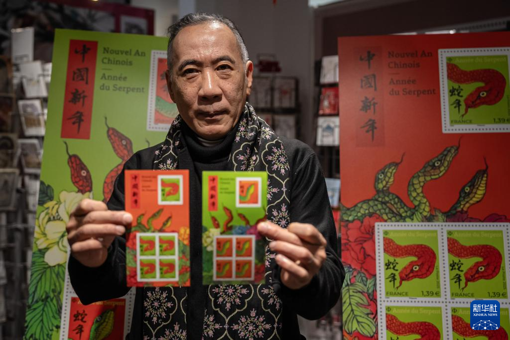 1月18日,在法國巴(ba)黎舉行的蛇年生(sheng)(sheng)肖(xiao)郵票發行儀式上,設計(ji)者華人藝術家(jia)陳江洪展示蛇年生(sheng)(sheng)肖(xiao)紀念郵票。