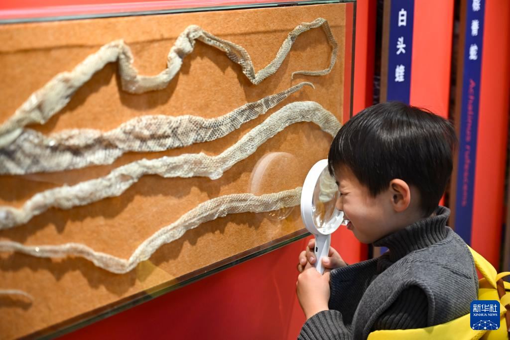 1月(yue)18日,小(xiao)朋友在(zai)上海自然博物館蛇年生肖特展上用放大鏡觀察蛇蛻標本。