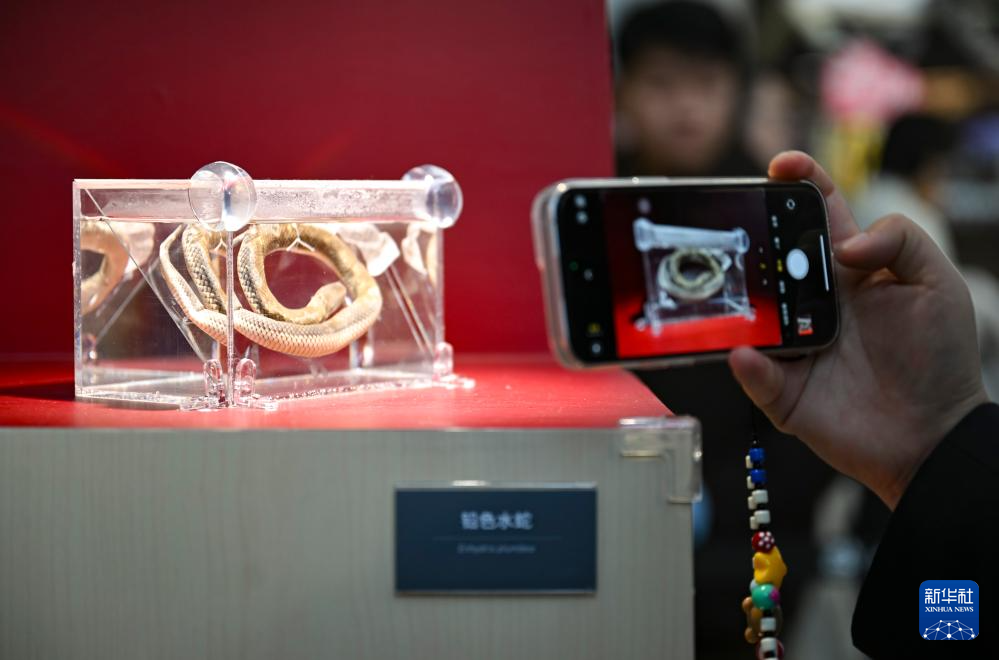 1月18日(ri),觀眾在上(shang)海自然博物館蛇年生肖特展上(shang)拍(pai)攝鉛色水(shui)蛇標本(ben)。