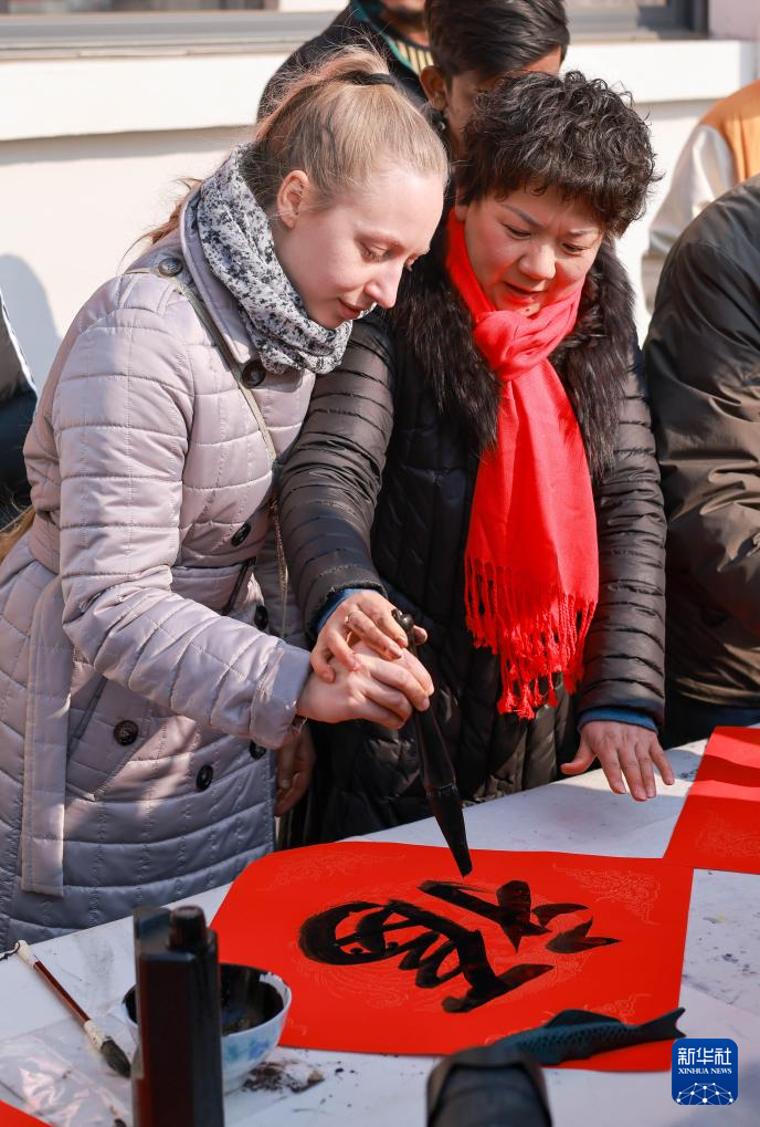 1月(yue)21日,在山(shan)東省棗莊市薛城區魯封橋大集,外(wai)國留學生體驗寫春聯(lian)。