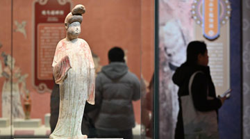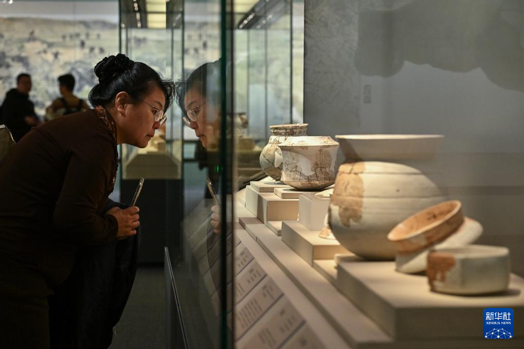 1月21日,參觀者在“萬(wan)古長歌——湖南(nan)史前文明圖(tu)卷展”上觀看陶器(qi)。
