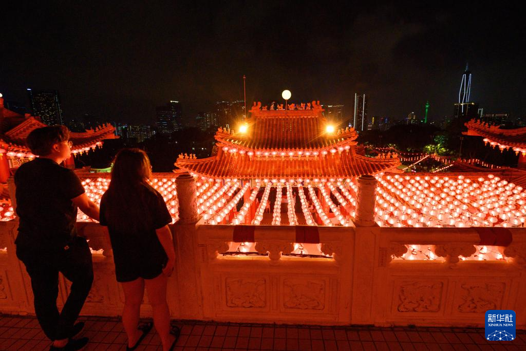 1月21日,在(zai)馬來(lai)西亞吉隆坡天(tian)后宮,市民欣賞節日彩燈。