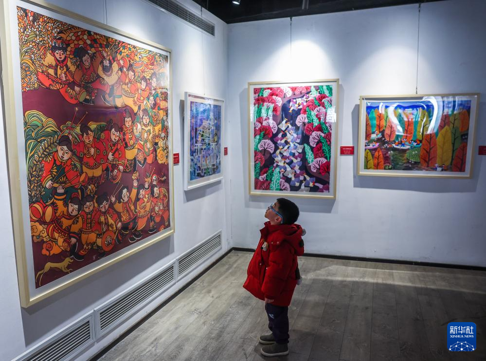 1月(yue)23日,一名小朋友在湖州吳興的小西街西岸美術館觀(guan)賞年畫美術作品。
