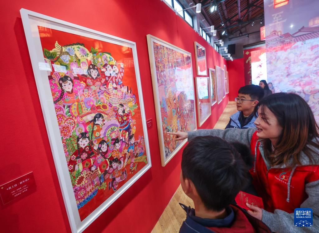 1月23日(ri),在湖州吳興的小西街朝陽里堂年(nian)畫(hua)展現(xian)場,游客在志愿者的帶領下觀(guan)賞年(nian)畫(hua)作品。