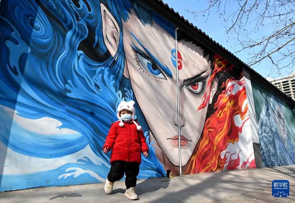 2月19日,小朋友(you)在(zai)石家莊市裕(yu)華區(qu)富強大街與(yu)塔南路交(jiao)口處哪吒主題墻繪前拍照。