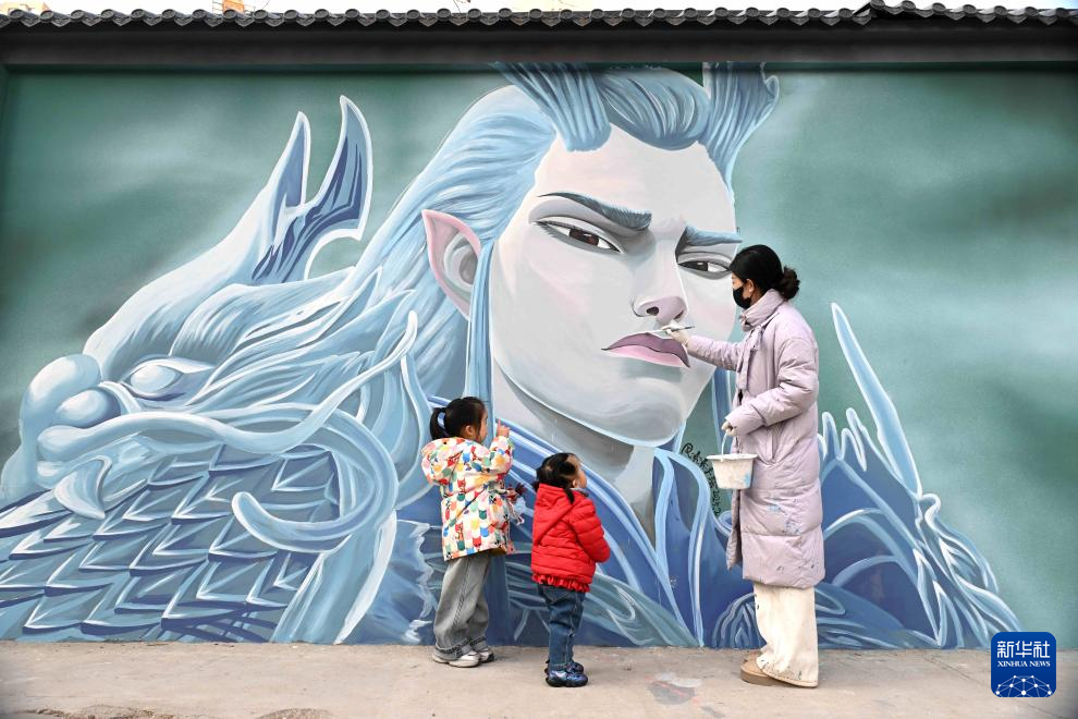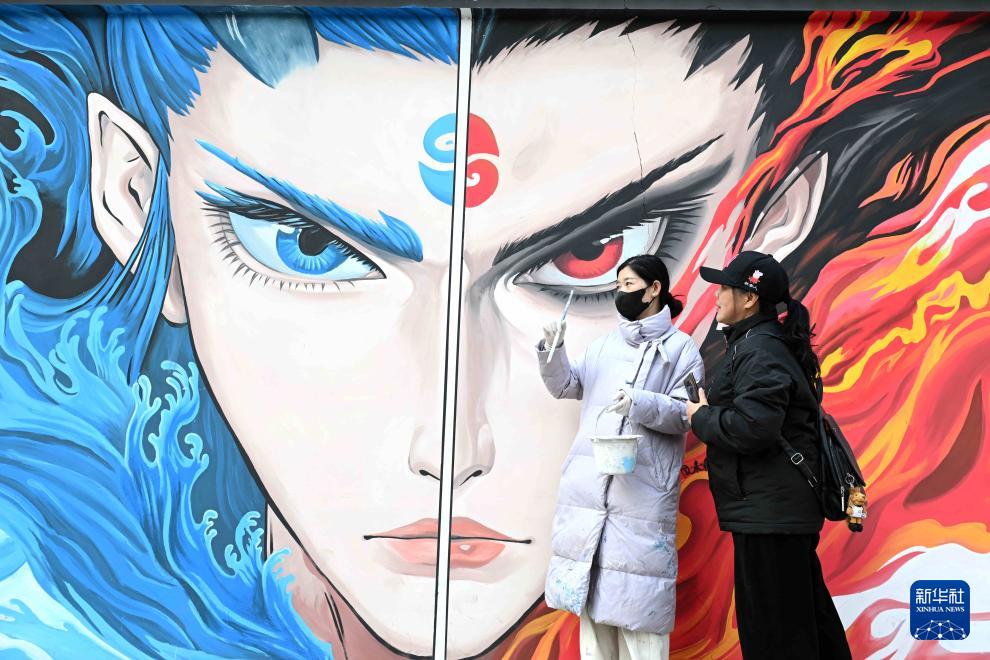 2月19日,畫師(右)在(zai)石家莊市裕華區(qu)富強大街與塔南(nan)路交口處創作(zuo)哪(na)吒(zha)主題(ti)墻繪。