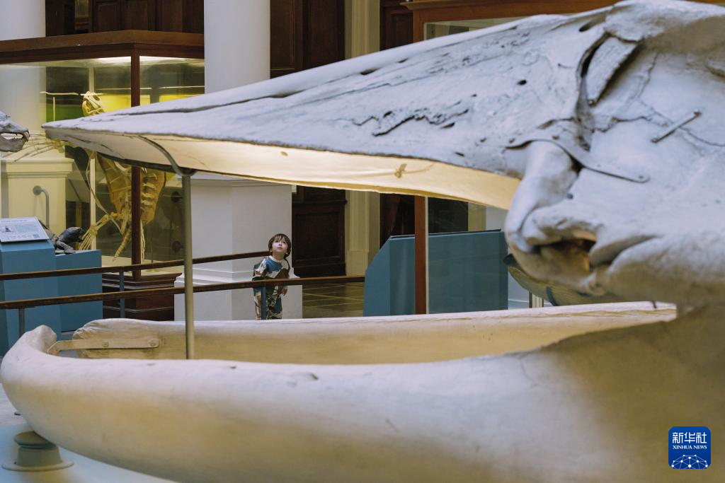 6月20日,一名小朋友在阿根廷拉普拉塔博物館內參觀藍鯨頭骨。