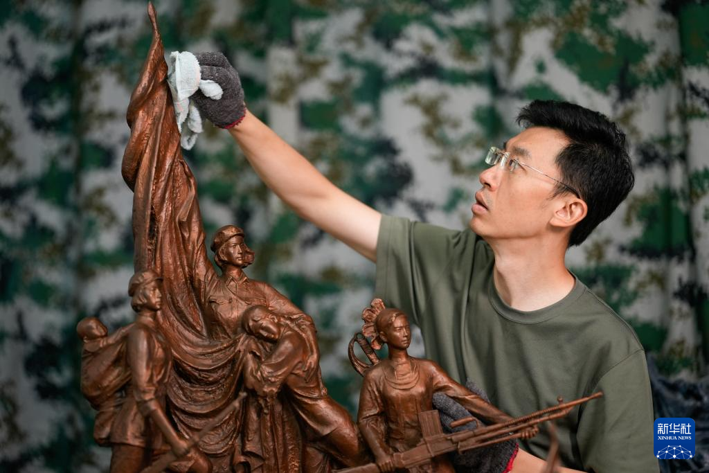 7月17日,解放軍文工團雕塑創作員郎鉞在擦拭雕塑。